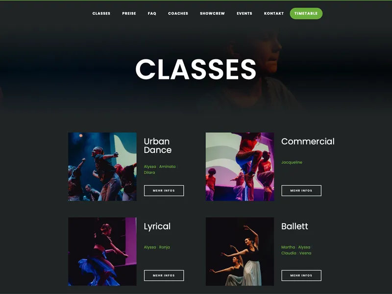 Die neue Webpräsenz setzt auf ein selbstbewusstes Design mit dunklem Theme, kräftigen Akzentfarben und lebendigen Animationen. Großflächige Videos und Galerien lassen die Besucher:innen direkt in die Welt von Topmoves eintauchen – dynamisch, energiegeladen, echt. Der Look ist modern und urban, dabei klar strukturiert und intuitiv nutzbar.